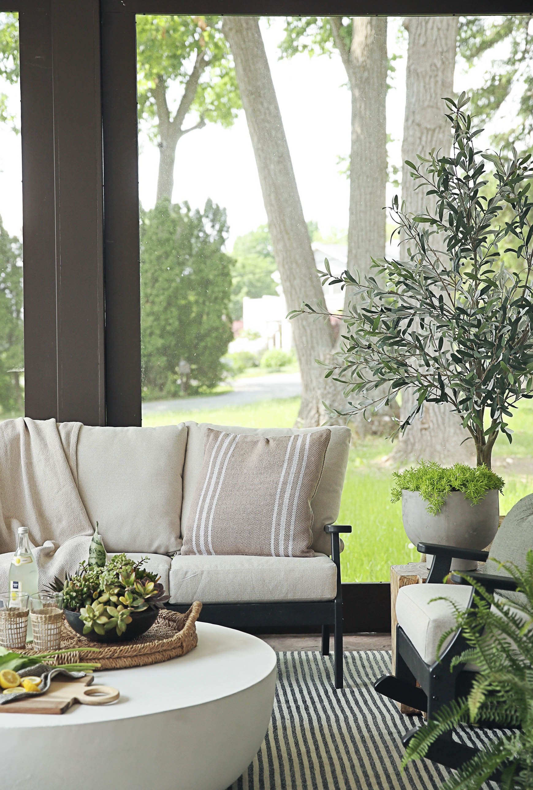 Add a large outdoor rug to ground the space, big enough so all furniture sits comfortably on it. It instantly creates that “outdoor living room” feeling (and yes, it should feel good barefoot).